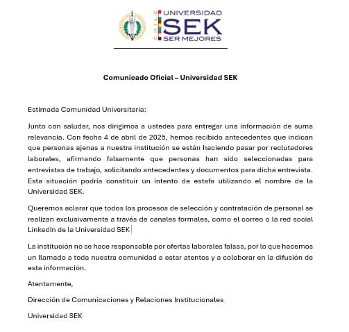 Junto con saludar, nos dirigimos a ustedes para entregar una información de suma relevancia. Con fecha 4 de abril de 2025, hemos recibido antecedentes que indican que personas ajenas a nuestra institución se están haciendo pasar por reclutadores laborales, afirmando falsamente que personas han sido seleccionadas para entrevistas de trabajo, solicitando antecedentes y documentos para dicha entrevista. Esta situación podría constituir un intento de estafa utilizando el nombre de la Universidad SEK.