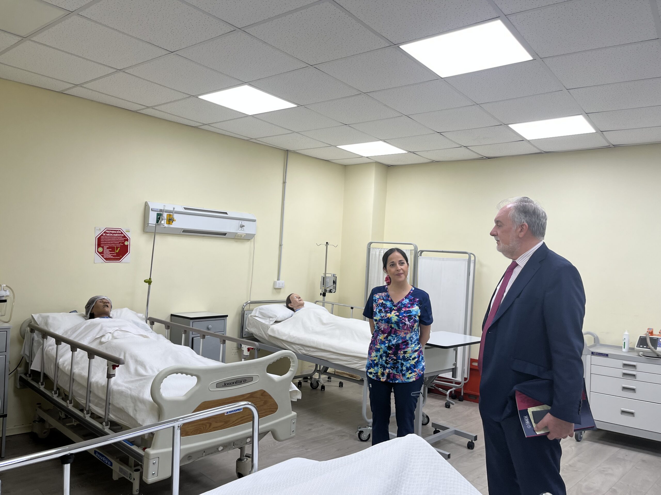 Posteriormente, el Cónsul realizó un recorrido por las dependencias de la universidad, visitando la Sala de Litigación de la carrera de Derecho y el Centro de Simulación de la Facultad de Ciencias de la Salud, donde pudo conocer en detalle el equipamiento, la metodología de enseñanza y las innovaciones tecnológicas que fortalecen la formación práctica de los y las estudiantes.