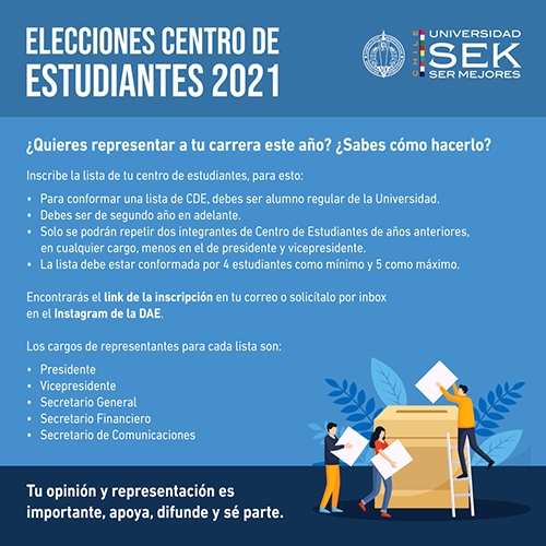 Hasta el 24 de mayo se pueden presentar listas para postular a los Centros de Estudiantes de Universidad SEK. La convocatoria, abierta desde el pasado 10 de mayo, está dirigida a las carreras de pregrado regular.