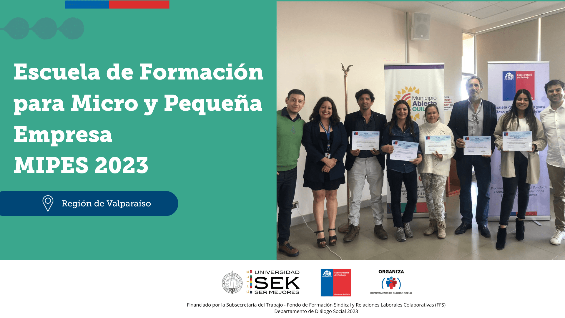 Este hito de finalización se llevó a cabo en la Municipalidad de Quilpué, en compañía de Scarlette Olguín, Jefa de Gabinete SEREMI Trabajo y Previsión Social de la V Región, el Concejal Patrick Retamales y Jorge Isbej Riquelme, coordinador del equipo de Formación Continua.