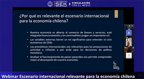 La Facultad de Administración, Finanzas y Negocios de USEK presentó el jueves 15 de abril el webinar Escenario Internacional relevante para la economía chilena, en el cual participo el señor Miguel Fuentes Díaz, Gerente de Análisis Internacional del Banco Central.