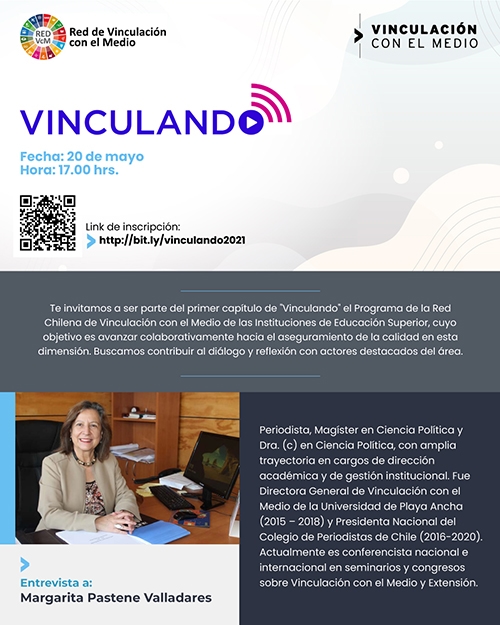 El miércoles 20 de mayo se transmitirá el primer capítulo del programa Vinculando, instancia radial de la Red Chilena de Vinculación con el Medio de las Instituciones de Educación Superior (IES) a la cual pertenece nuestra Universidad.