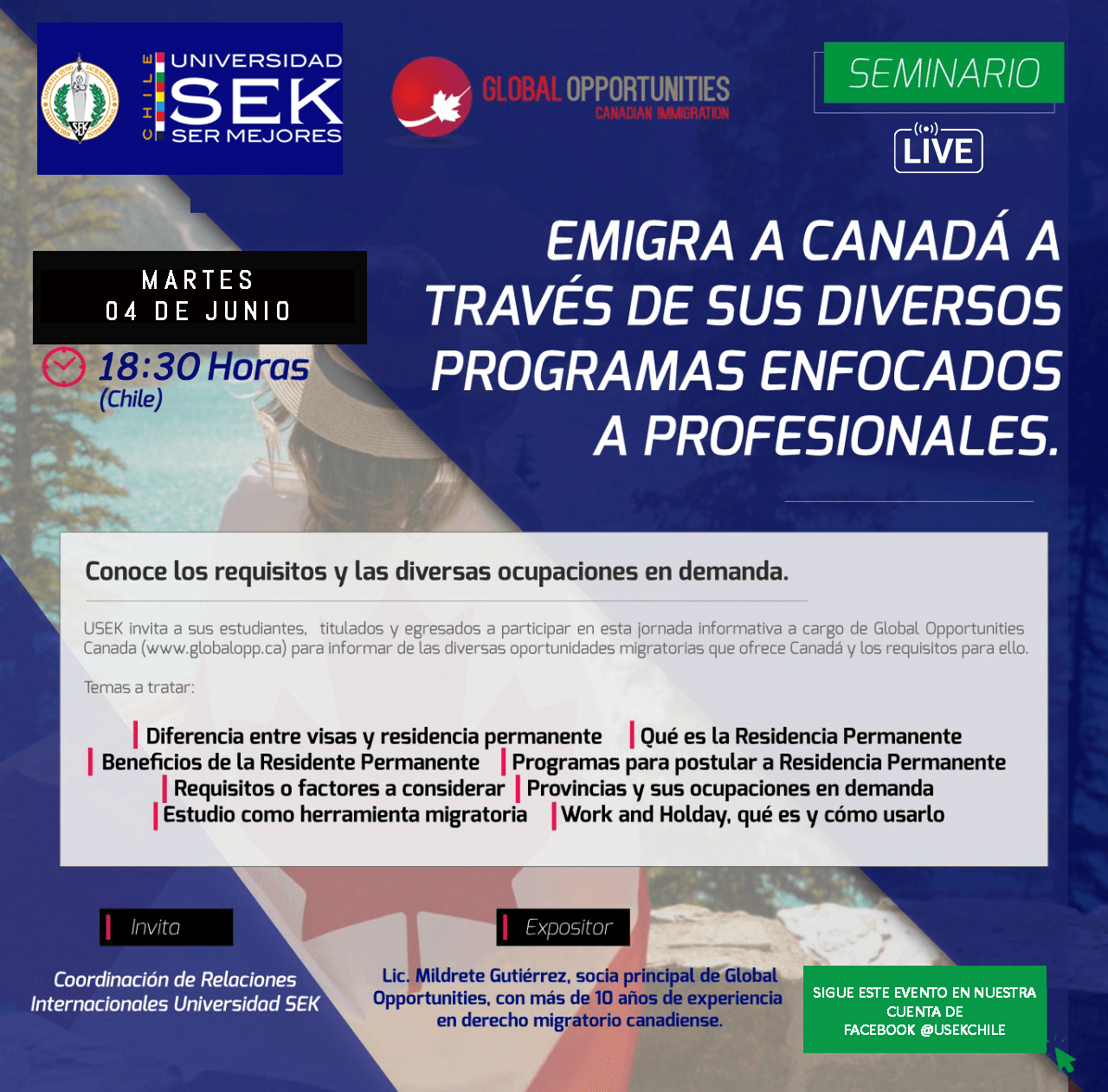 La Coordinación de Relaciones Internacionales organizó para este martes 04 de junio el seminario Emigra a Canadá a través de sus diversos programas enfocados a profesionales, evento que será presentado por Global Opportunities.